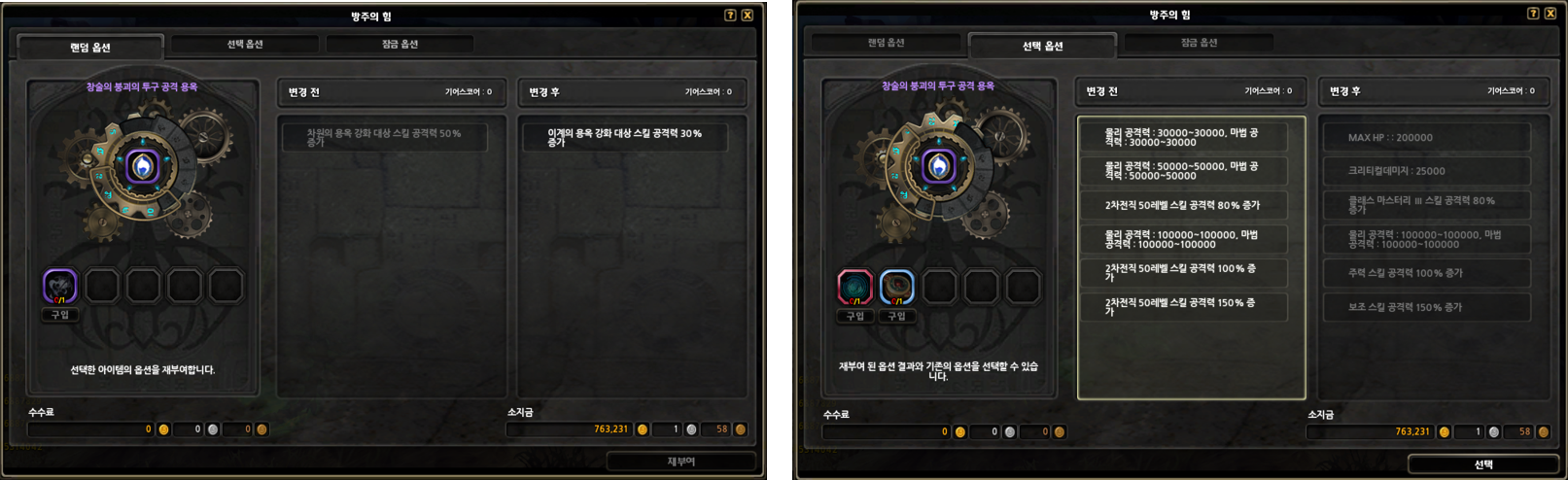 • “선택 옵션” 재부여를 위해서는 “붕괴의 정수(거래가능/거래불가)” 및 “파키하의 기계 부품” 아이템이 필요합니다.