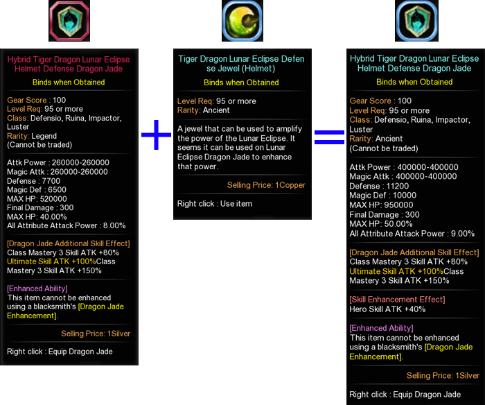 • Tiger Dragon Lunar Eclipse Jewel (Ancient) can be used to evolve Tiger Dragon Lunar Eclipse Dragon Jade (Legend) to Tiger Dragon Lunar Eclipse Dragon Jade (Ancient).