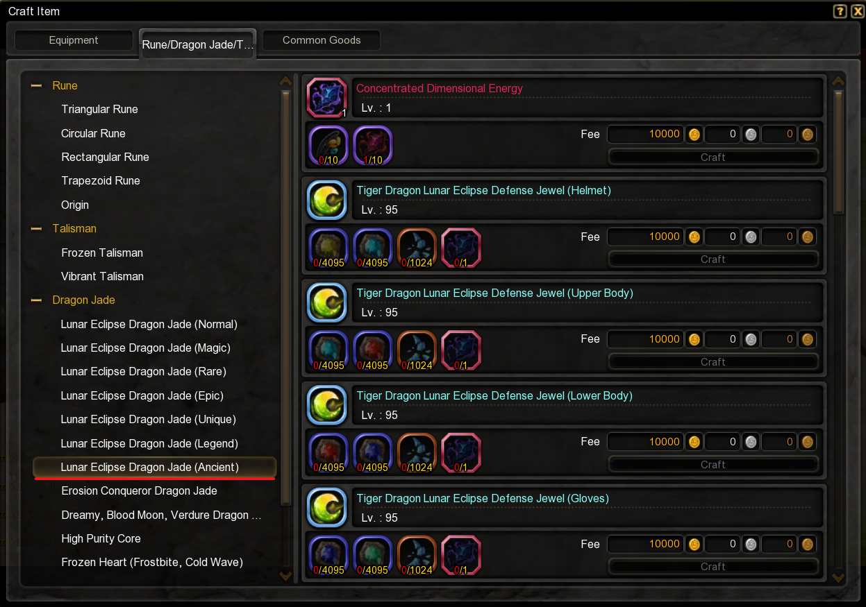 • Tiger Dragon Lunar Eclipse Jewel (Ancient) crafting requires the new material item Concentrated Dimensional Energy.