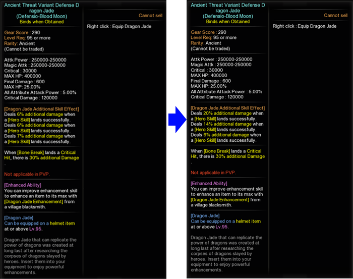 • 3 different Ancient Power (Hero Skill) Additional Damage add-on stats are applied at random for Ancient Variant Defense Dragon Jade (5% – 30% varied probability rates)